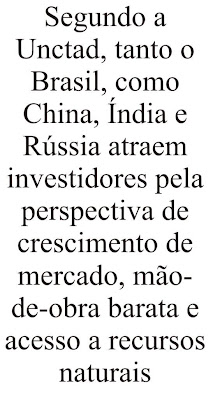 ia da ONU para o desenvolvimento do comércio (Unctad), o Brasil fica atrás apenas de China, Estados Unidos e Índia na preferência de empresas estrangeiras para investimento entre 2009 e 2011.